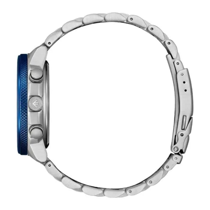 The Promaster Air Global Radio-Controlled Chronograph is a masterclass in precision timekeeping, encased in a robust stainless steel body complemented by a rich blue bezel. Its dial, a complex network of subdials and functions, is laid out under a sapphire crystal with anti-reflective coating, ensuring optimal visibility in all conditions.This timepiece, running on the caliber E660 movement, is a technical powerhouse, boasting a plethora of features including a Radio Controlled and World Time function, 24-hour display, an alarm, a perpetual calendar and a chronograph function that captures elapsed time with impeccable accuracy. The watch is further equipped with a date and day display, ensuring all essential information is readily at hand.Eco-Drive technology sits at the heart of this instrument, drawing energy from any light source to eliminate the need for battery changes and keep your watch running smoothly for approximately 6 months on a full charge. This innovation is complemented by a power reserve indicator, a power saving function, and standard features like an insufficient charge warning and overcharge prevention function.With a case size of 43.7mm and a thickness of 13.3mm, the watch presents a commanding presence on the wrist, balanced by its weight of 165g that ensures a substantial yet comfortable feel. The watch is water-resistant to 20 bar, making it suitable for professional marine activity and serious surface water sports.