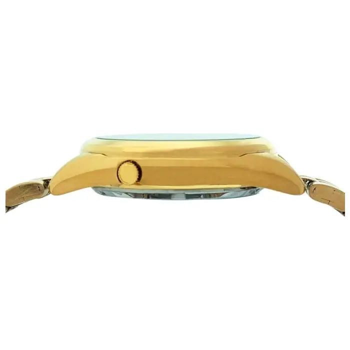 The Seiko SNKL38K1 is a refined and distinct timepiece from the classic "Seiko 5" collection, offering a unique blend of traditional elegance and mechanical reliability. This model features a polished 37mm Gold Tone Stainless Steel Case (width), a versatile size that offers a sophisticated presence on the wrist without being overpowering. The rich gold-tone finish provides a luxurious, jewelry-like aesthetic, making it an ideal choice for formal occasions or for adding a touch of warmth to a daily wardrobe. The standout feature of this watch is its captivating Gold Sunburst Dial, which is detailed with a rare and elegant mix of indices. It features Black Roman Numerals at the even hours (2, 4, 6, 8, 10, 12) and stick markers at the odd hours, creating a distinguished and readable look that sets it apart from standard models. Luminous gold-tone hands ensure visibility in low light, while the day and date window at 3 o'clock adds practical utility. The face is protected by Seiko's durable Hardlex Crystal, designed to resist impacts better than standard mineral glass. Powered by the robust Seiko Caliber 7S26 Automatic Movement, this watch is a self-winding mechanical marvel that uses the motion of your wrist to stay running, eliminating the need for a battery. The intricate workings of the movement can be admired through the exhibition case back. Secured by a matching gold-tone Stainless Steel Men's Watch bracelet with a deployment clasp, and offering 30-meter water resistance, the SNKL38K1 is a stylish and dependable companion for the modern gentleman.