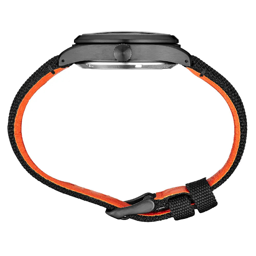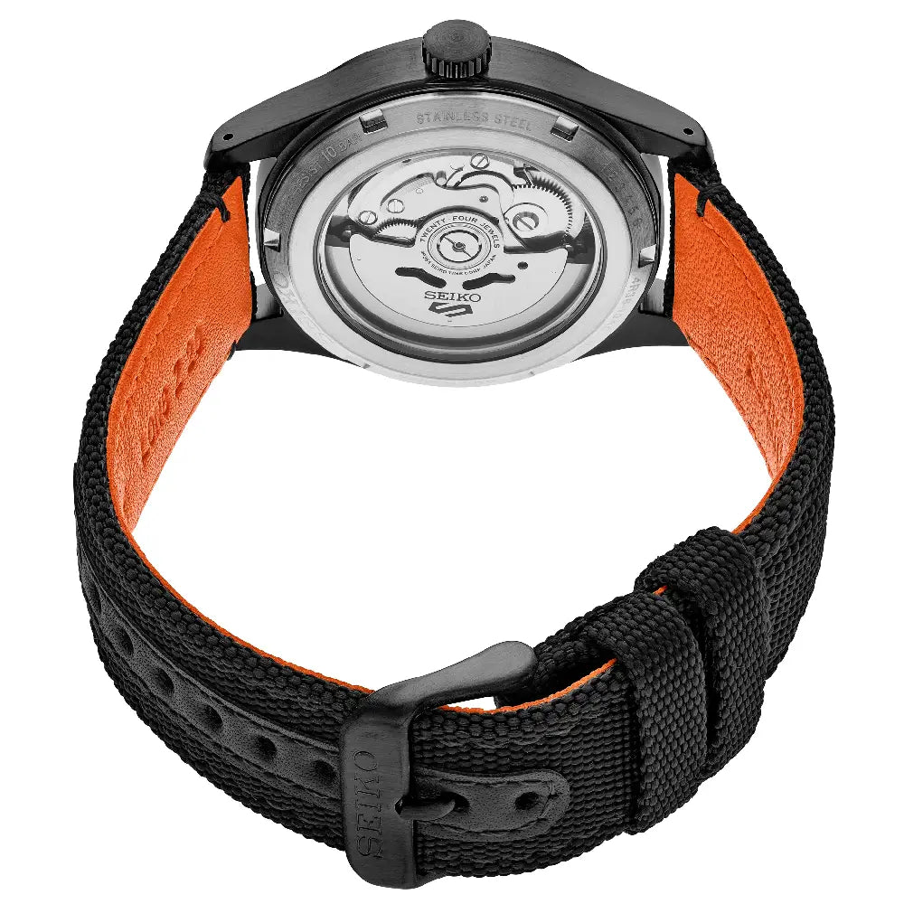 The Seiko 5 Sports SRPH33K1 is a bold and tactical iteration of the "Field" collection, drawing heavy inspiration from classic military aviation timepieces. This model adopts the "Flieger Type B" dial layout, transforming the historical pilot's tool watch into a modern, street-style accessory suitable for casual wear while retaining excellent legibility and a stealthy aesthetic. The watch features a sharp Black Dial with striking orange Arabic numerals and hands, housed in a durable black ion-plated (IP) stainless steel case measuring 48.1mm in height and 39.4mm in width. The dial utilizes the distinct Type B configuration, emphasizing minutes on the outer ring and hours on the inner ring, a hallmark of pilot watches. The analog hands provide a clean reading of the local time, while the day and date display at the 3 o'clock position offers essential modern utility. Powered by a reliable automatic movement (approx. 41-hour power reserve), the mechanical module includes the 4R36 caliber (with manual winding and hacking capabilities), a see-through caseback, and strong LumiBrite application. With a profile of 13.2mm and a 100-meter water-resistant construction, this "Black & Orange Flieger" offers a perfect blend of military heritage and contemporary urban style.