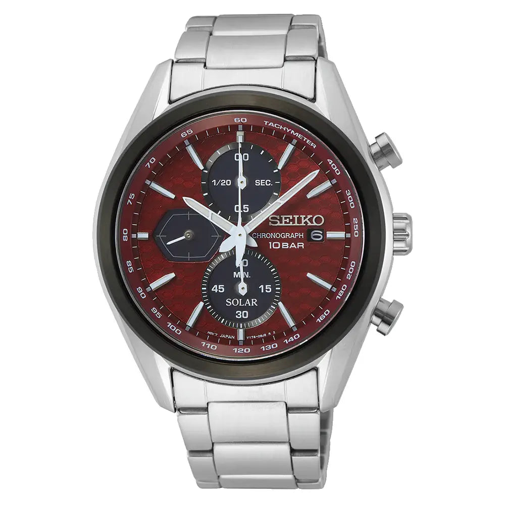 The Seiko SSC771P1 is a vibrant and dynamic model from the "Macchina Sportiva" (Italian for "Sporty Machine") collection, designed to capture the excitement of high-speed automotive engineering. This model transforms the functional solar chronograph into a striking statement piece suitable for both casual and sporty-dress occasions, featuring a distinctively European design flair. The watch features a bold Red Dial with a unique hexagonal honeycomb texture reminiscent of a car's radiator grille, housed in a robust stainless steel case measuring 41.4mm in width. The sub-dials are neatly arranged to track elapsed time, while the analog hands and indices are coated with LumiBrite for clarity. A tachymeter scale on the outer rim adds to its racing utility, while the date display sits between the 4 and 5 o'clock positions. Powered by a reliable Solar movement (approx. 6-month power reserve once fully charged), the quartz module includes the V176 caliber, which eliminates the need for battery changes. It is protected by a scratch-resistant Sapphire Crystal—a premium upgrade for this class—and features a screw-down caseback. With a profile of 12.1mm and a 100-meter water-resistant construction, this "Red Macchina" offers a perfect blend of automotive style and everyday practicality.