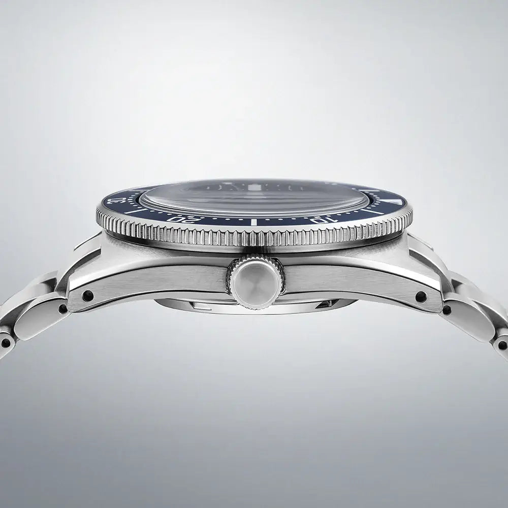 The Seiko Prospex SPB451J1 is a refined and dressy iteration of the timeless "1965 Diver's" (62MAS) series, upgrading the classic design with a premium Curved Sapphire Crystal and improved water resistance. This update transforms the vintage icon into a sophisticated accessory suitable for formal wear while retaining its professional tool watch charm. The watch features a sharp Blue Dial with luminous baton indices, housed in the compact stainless steel case measuring 46.4mm in height and 40mm in width. The analog hands provide a clean reading of the local time, while the discrete date display positioned between 4 and 5 o'clock offers essential modern utility without disrupting the symmetry of the indices. Powered by a reliable automatic movement (approx. 72-hour power reserve), the mechanical module includes a 6R55 caliber (offering a full 3-day runtime), a unidirectional rotating bezel, a screw-down crown, and a stop-seconds function. With a profile of 13mm and an upgraded 300-meter water-resistant construction, this "Heritage Diver" classic offers a perfect blend of elegance and everyday practicality.