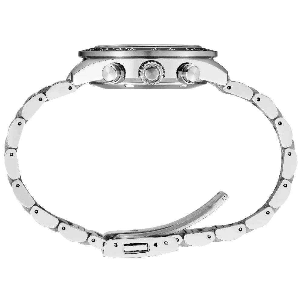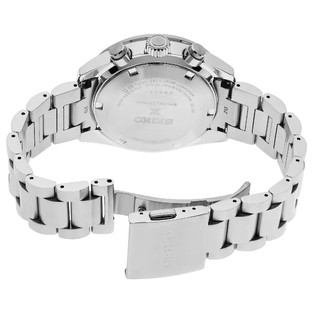 The Seiko SSC927P1 (often designated as the SSC927 and released as a Special Edition in some regions) is a dynamic and high-performance addition to the celebrated "Speedtimer" collection. This model is distinguished by its larger, more commanding 41.4mm Stainless Steel Case, offering a bolder presence than its 39mm counterparts while maintaining the ergonomic tapered profile that ensures a comfortable fit. The case features a blend of hairline and mirror finishes, showcasing Seiko's attention to detail and professional sports heritage. The defining feature of this timepiece is its striking Red Sunburst Dial (often described as "Crimson" or "Magma"). This vibrant hue is inspired by the paintwork of vintage muscle cars and racing vehicles from the 1960s, paying homage to Seiko's history as a pioneer in sports timing. The dial is framed by a sleek Black Tachymeter Bezel made of aluminum, reinforcing its automotive DNA. The sub-dials are rendered in a contrasting black, ensuring high legibility for the chronograph functions, which include a 60-minute counter and a 24-hour indicator. Powered by the advanced Seiko Caliber V192 Solar Movement, this watch converts any light source into energy, offering a 6-month power reserve when fully charged and eliminating the need for regular battery changes. A power reserve indicator is conveniently integrated into the dial. Protecting the face is a Curved Sapphire Crystal with an anti-reflective coating on the inner surface, ensuring superior scratch resistance and clarity. Secured by a solid Stainless Steel Men's Watch bracelet with a three-fold clasp, and offering 100-meter water resistance, the SSC927P1 is built for those who view life as an adventure.