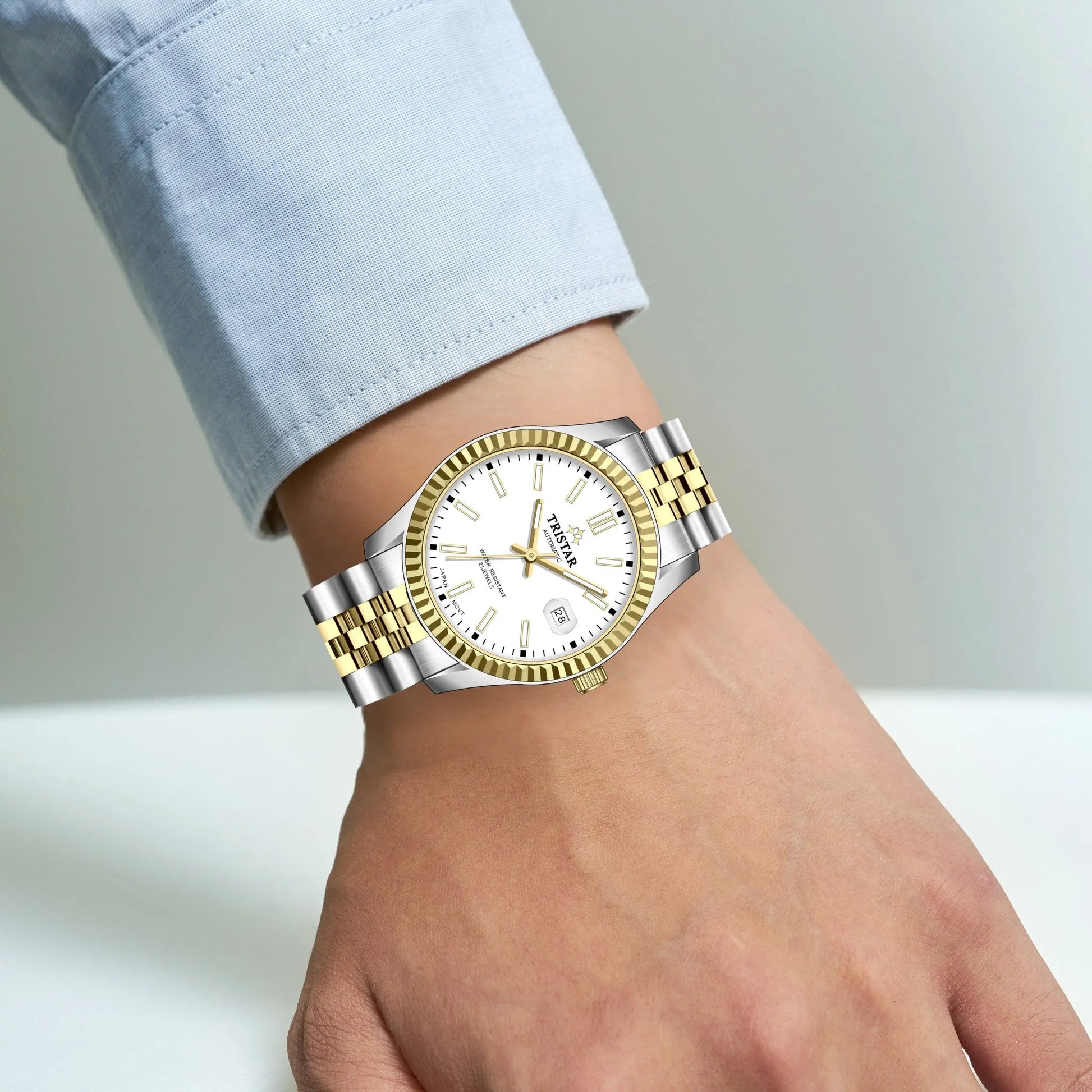 Experience a luxurious blend of classic watch design and modern mechanical precision with the Tristar RD-Series Automatic RD31WM2TM02 men's watch. This distinctive timepiece features a crisp White dial with elegant luminous index markers, all housed within a polished 40mm stainless steel case. The case boasts a striking gold-toned fluted bezel, contrasting beautifully with the silver case sides. At the heart of this watch is a reliable Japanese Automatic Movement (21 Jewels), ensuring smooth and accurate timekeeping. The elegant dial is protected by a scratch-resistant Sapphire Crystal Glass. It features a prominent Date Indicator at the 3 o'clock position. The movement is proudly displayed through a See Through Caseback. The watch is completed by a refined Two-Tone Gold Jubilee Band (Stainless Steel bracelet) with a secure Butterfly Clasp, and offers a water resistance rating of 30 meters (3 Bar), suitable for daily wear and resistant to splashes.