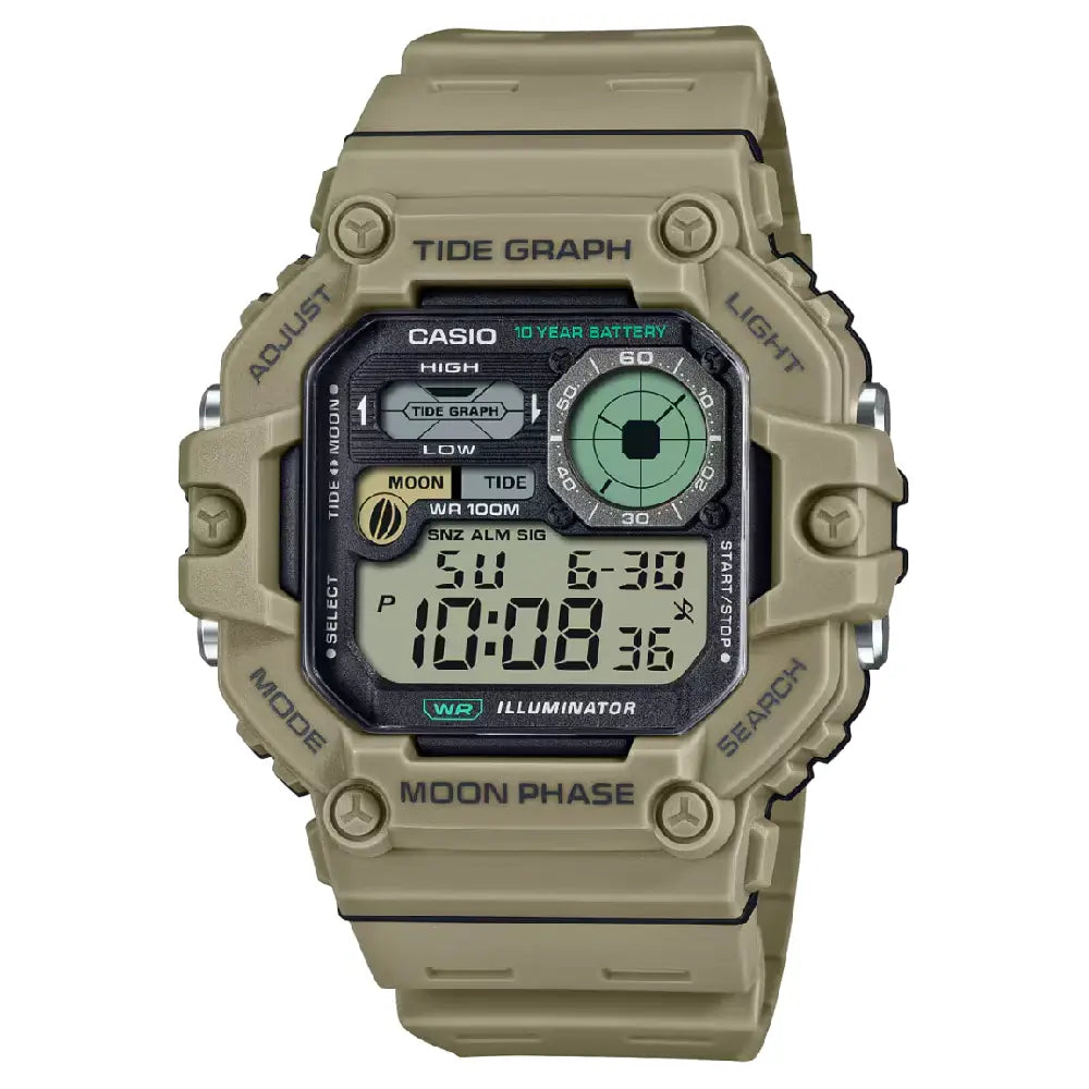The Casio Sports WS-1700H-5AVDF is a durable and highly functional digital watch designed for marine and outdoor enthusiasts. Its standout features include a Tide Graph that displays current tide conditions and a Moon Data feature that shows the moon's age and phase. It also boasts a long-lasting 10-year battery life, dual time, a stopwatch, and an LED backlight. With 100-meter water resistance, it is suitable for swimming and water sports. The watch's tough beige resin case and comfortable resin strap ensure durability and a secure fit for any activity.